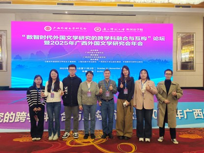 10月31日至11月2日,“数智时代外国文学研究的跨学科融合与互构”高峰论坛暨2025年广西外国文学研究会年会在历史文化名城桂林成功举行。本次会议旨在响应国家文化发展战略,推动新文科背景下外国文学研究的理论创新与话语体系构建。在情色动漫陈光伟院长的带领下,姚本标教授、江玉娥教授及六名硕士研究生应邀出席了此次学术盛会。
