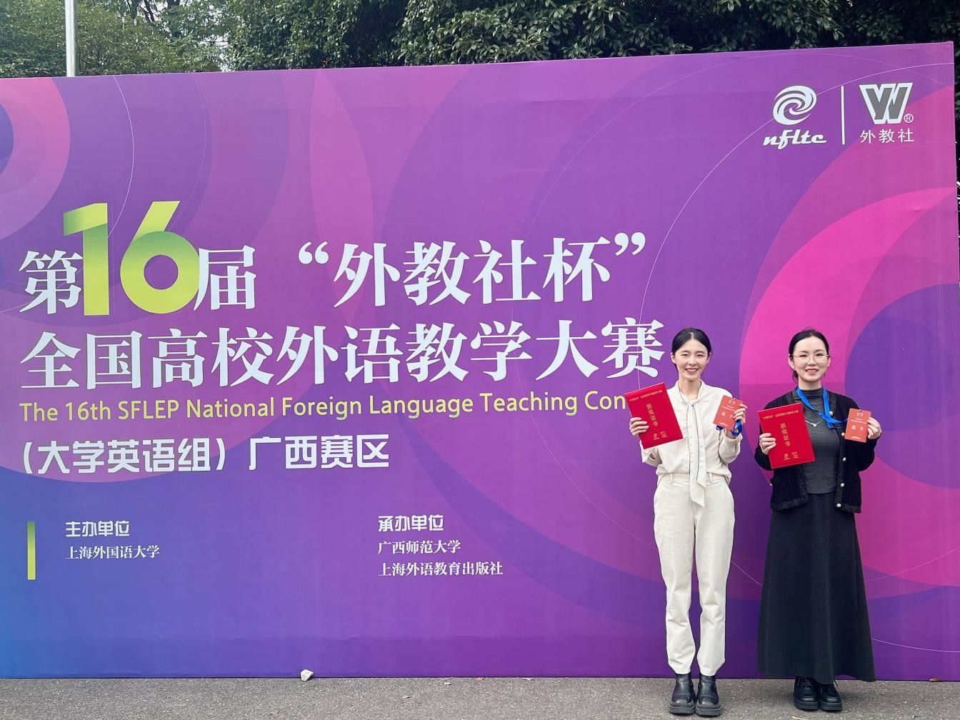 本次比赛于11月8日至9日于广西师范大学举行,吸引了来自全区26所高校的52名优秀教师同台竞技,竞争激烈。比赛首日为现场授课环节,全面考验教师的教学设计、课堂实施与反思能力。在比赛中,唐艺嘉、钟荛键两位老师沉着自信,她们的授课环节构思精巧、重点突出,展现了过硬的教学素养。在9日的十五分钟限时说课决赛中,两位老师的说课逻辑清晰、理念先进,其中唐艺嘉老师的整体优异表现获得了评委组的高度认可,获得了视听说课组决赛的第一名。