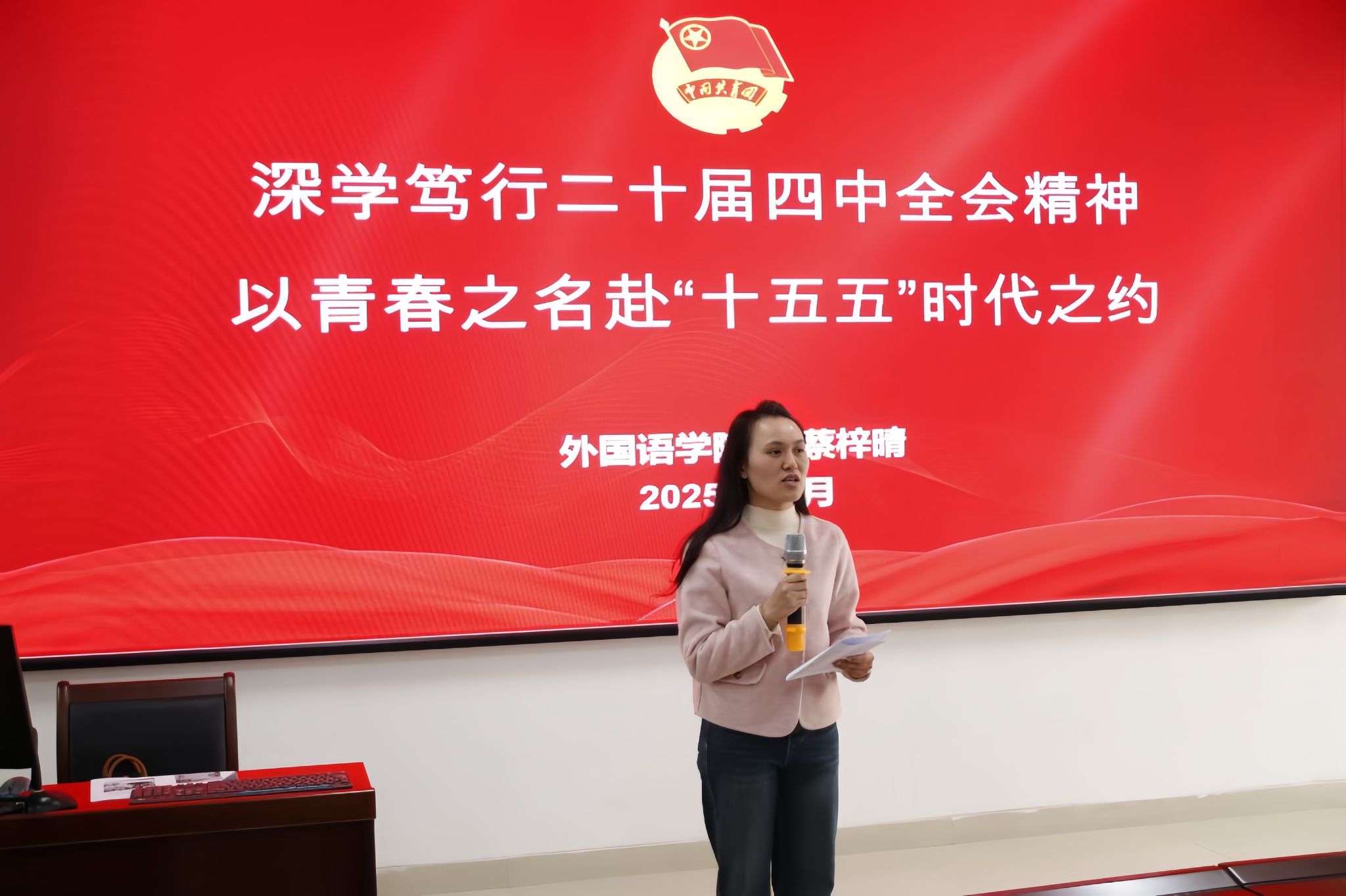 12月9日,“深学笃行党的二十届四中全会精神 以青春之名赴‘十五五’时代之约”专题培训讲座在武鸣校区实验楼1B-515报告厅举行。学院团委书记蔡梓晴老师担任主讲人,她围绕系统解读了党的二十届四中全会主要内容,并结合学院的思想政治教育、专业学习、社会实践、文体活动等方面内容,强调了新时代青年肩负的责任与使命。蔡老师鼓励学员们深入学习贯彻全会精神,将其转化为成长成才的强大动力,在今后的学习与工作中不断进取、勇担重任。