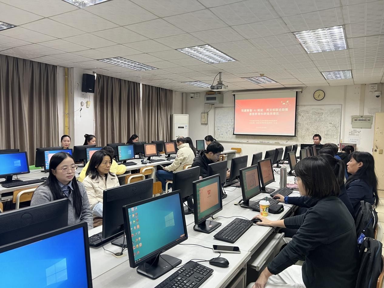 明秀校区文星楼905机房联合开展“党建聚智·AI赋能:联合助推语言教育科研提质增效”主题党日活动。活动特邀我校人工智能学院覃开贤副教授进行专题讲授与实操指导,两个支部的全体党员及学院其他教师共同参与。