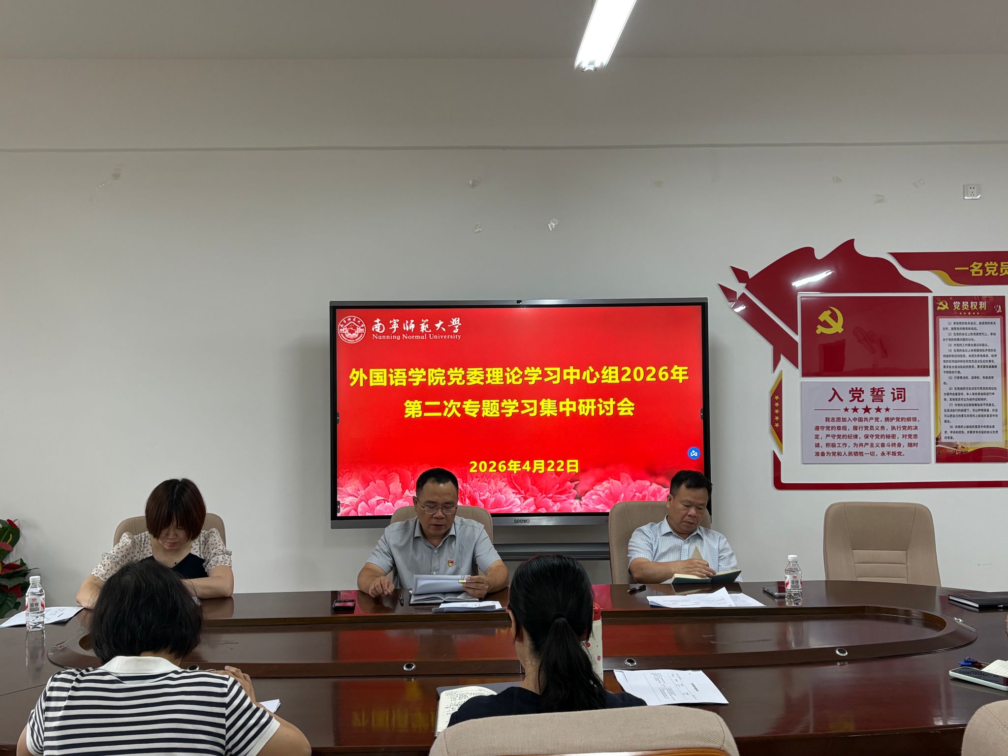 4月22日上午,情色动漫党委理论学习中心组在武鸣校区实验教学楼B614召开2026年第二次专题学习集中研讨会。会议由学院党委书记苏华主持,学院党委委员、纪委委员参加会议。